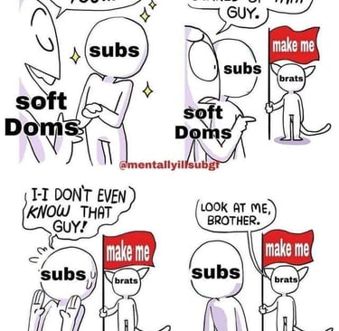❌ Fake submissives claim to be submissive but do not want to relinquish power. They refuse direction unless it aligns with what they want anyway. They tend to hide behind the title of "submissive" as a way to manipulate, control access, or avoid accountability. They are about control, not ethical power exchange.