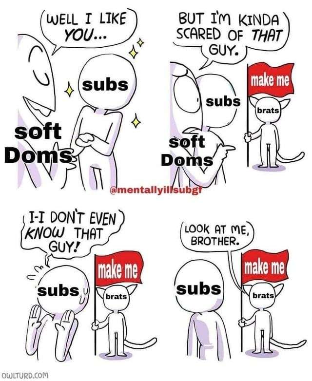 I'm repeating this in case you missed the section about similar behaviors by dominants. This section is not making a One True Way argument. We all show up in scenes and dynamics in our own ways and those presentations can be influenced by trauma, attachment wounds, and any number of communication snafus. We all make mistakes that can hopefully become teachable moments. This section is NOT referring to folks showing up authentically.