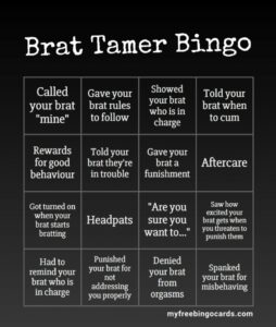Brat Tamers tease their submissives, or brats, remaining playful even when issuing verbal corrections or reprimands. The Brat Tamer can enforce rules and expectations with punishments but this is often the goal of the brat’s behavior. The reprimand becomes positive reinforcement with playful penalties.